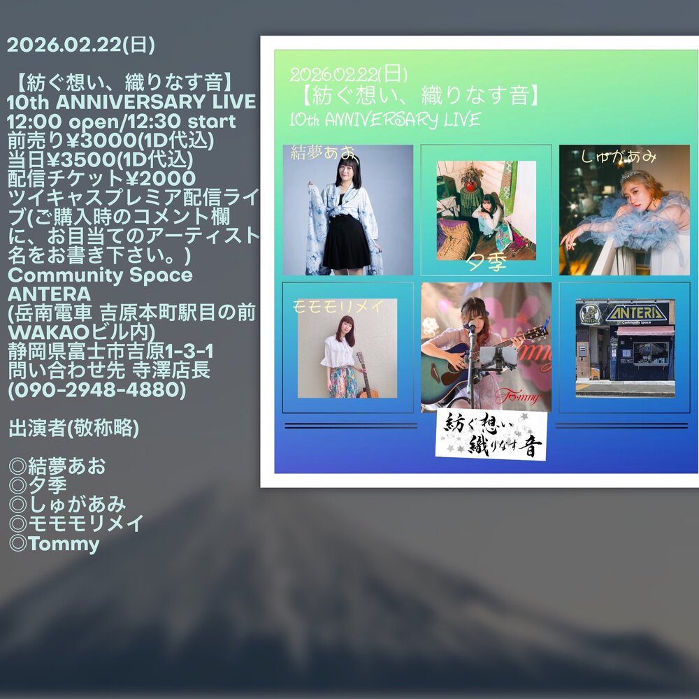【遠征】紡ぐ想い、織りなす音10th ANNIVERSARY LIVE@富士ANTERA SCHEDULE 2026/02/22(日) Community Space ANTERA 地図を表示 OPEN 12:00 / START 12:30 前売り¥3000(1D代込) / 当日¥3500(1D代込) 配信チケット¥2000 結夢あお/夕季/モモモリメイ/Tommy/しゅがあみ▶︎13:40〜 ツイキャスプレミア配信 ¥2,000 ※ご購入時のコメント欄にお目当てのアーティスト名をお書き下さい📝 配信チケットはこちら🎫 お取り置き URLをコピーする 報告する